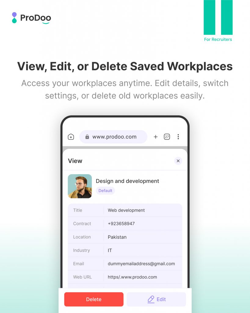 Your organization needs might change, and ProDoo allows you to adapt. You can access your saved workplaces at any time to view their specific details, such as contract numbers or locations. The detailed view also provides quick options to Edit the workplace settings or Delete old workplaces that are no longer in use, keeping your dashboard clutter-free.