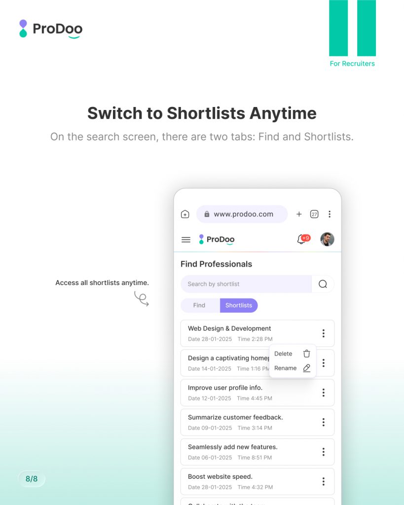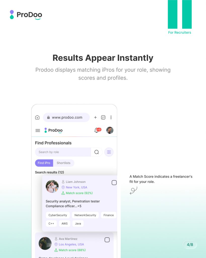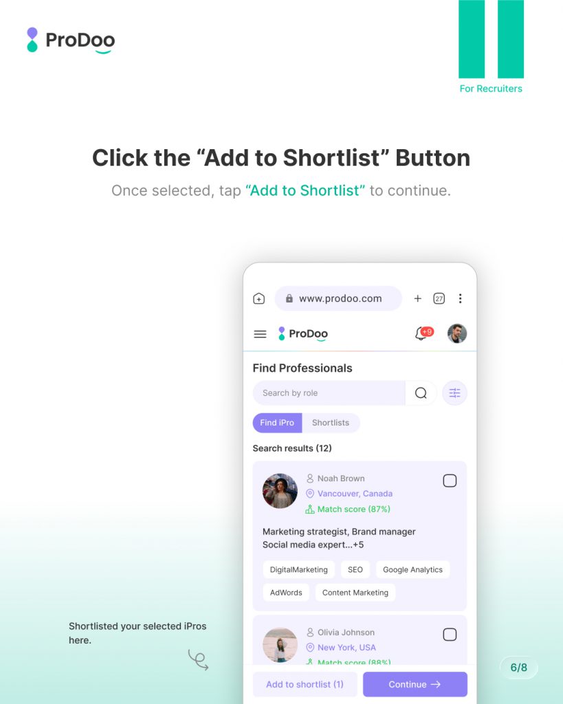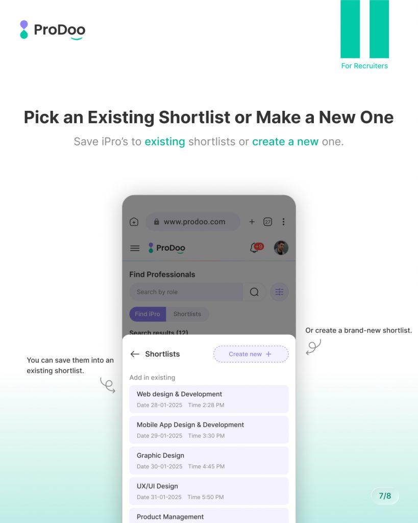 At Prodoo, we’ve designed the shortlisting experience to be fast, flexible, and recruiter-friendly, so you can focus on choosing the right talent — not managing messy workflows.This guide walks you through how to shortlist multiple iPros on Prodoo, using the same steps shown in the slides.